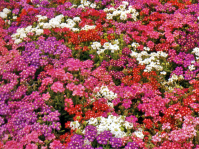 Sun-loving, sprawling annual with clusters of flowers ranging in colors from red, purple, pink, white, and two-toned varieties. Verbena blooms from late spring to fall. Best used in massed bed plantings, borders, in hanging baskets or patio pots.
