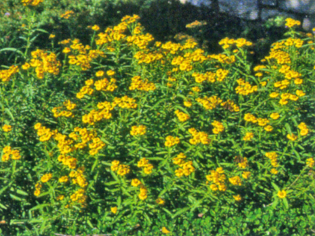 Clusters of golden yellow flowers from fall until first frost. Place this low water use plant in full sun; it is very drought tolerant. Plant averages 18-24" high and 12-18" across. Leaves have a pleasing anise-like scent when crushed. Native to Mexico where foliage is used for teas and seasoning.