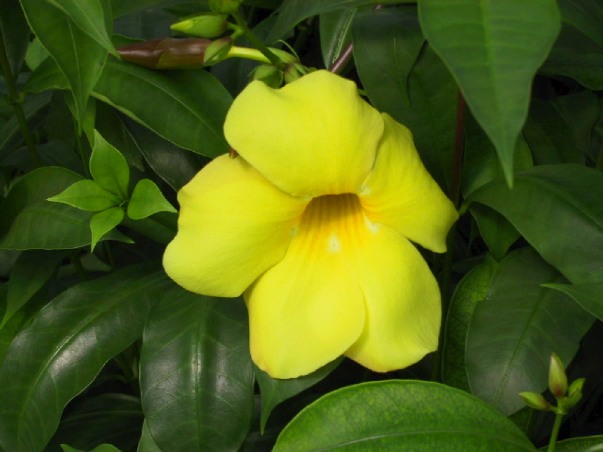 Beautiful trumpet-shaped butter-yellow flowers 4" across the summer. A fast growing tropical perennial vine that thrives in summertime heat. May be grown in containers or planted in the ground as flowering annual anywhere in the state. Train on trellis or let cascade out of container or hanging basket.